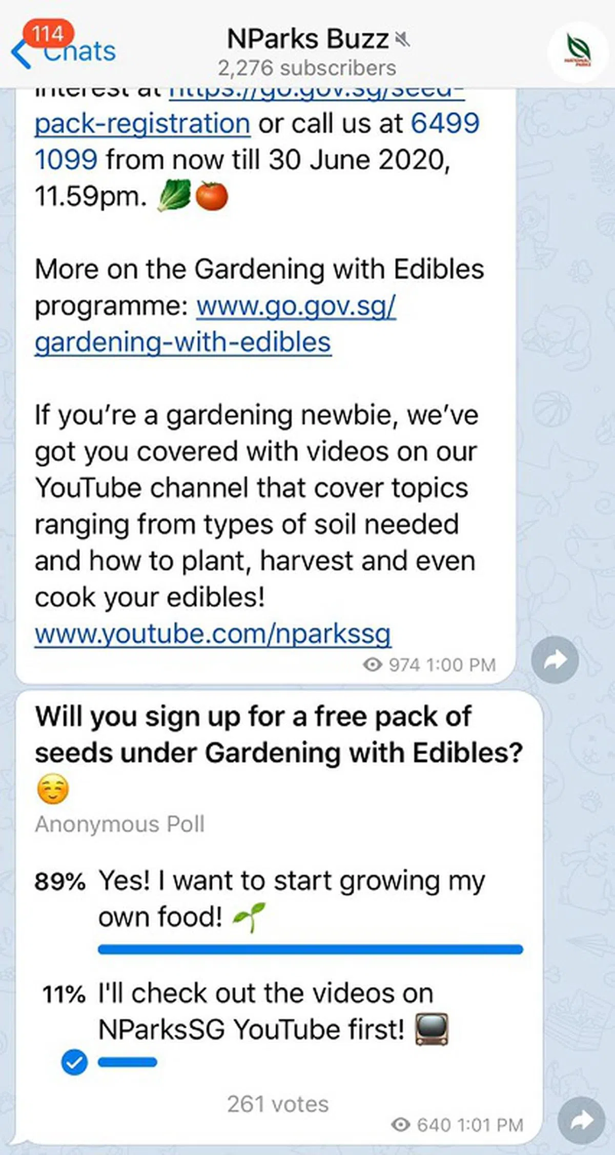 公园局通过社交媒体telegram做了一个民调,了解公众是否会领取菜籽包。截止今天下午4点,共有261人参加了调查,89%的人选择想要领取菜籽包开始种植自己的食物,只有11%的人说会看了当局提供的种植指导视频再作决定。