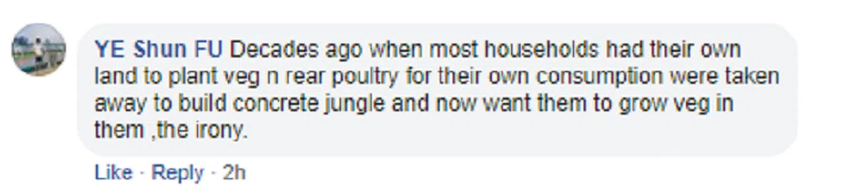 也有人指出,这么做有些讽刺。几十年前农民们都有自给自足的养殖地和种植地,为了发展经济这些土地被征收,盖起了水泥丛林,现在反过来让人民在水泥丛林里种菜。