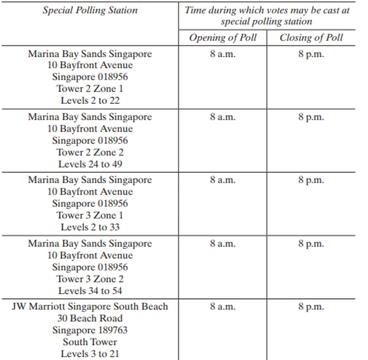 其中,滨海湾金沙酒店将设有四个投票站,分布在1座以及2座,每个投票站负责20层楼的房客,万豪酒店则只有一个投票站。