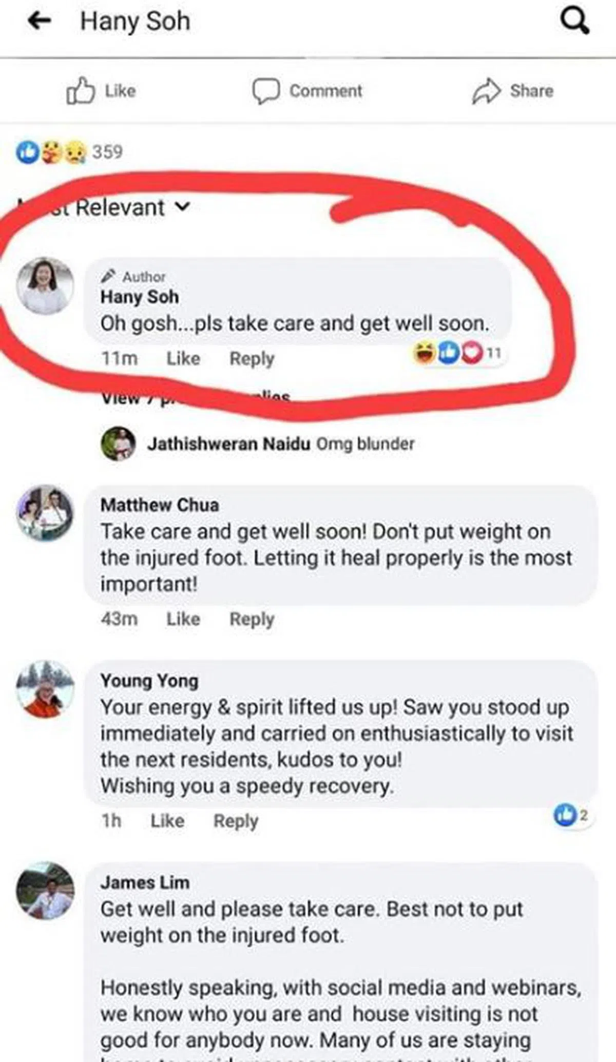 苏慧敏说,带着这种想法以及急不可待想见到居民的心情,昨午走访选区的第891B座组屋时,不小心在楼梯上踩空并跌倒,导致左脚骨折。(此处她还加上了一个“打脸无奈”的表情)因此,在接下来的四周里不得不减少家访。 看来,她需要至少四周的时间才能完全康复。