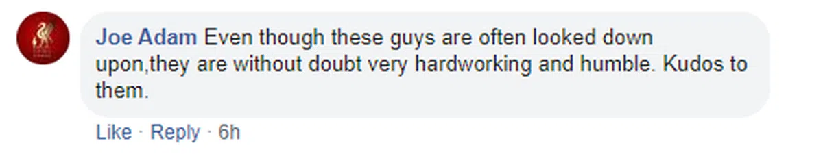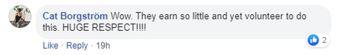 另一名网民叹说,客工们所赚的薪水这么少,但还愿意利用自己的休息时间去回馈社会,无比的尊敬!