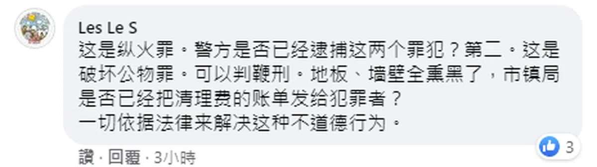 有网民质疑,由于焚烧地点位于组屋底楼的地面,同时火源也非常接近柱子,视频中两位男子的行为是否已经构成破坏公物的罪名?