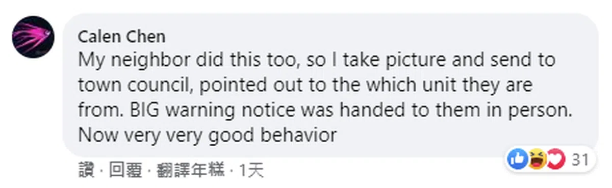 “我的邻居也曾经这么做过,所以我拍了照片传给市镇会,告知他们属于哪一个单位。后来他们就收到了一封‘大大的’警告信,现在乖得跟什么一样。”
