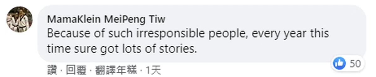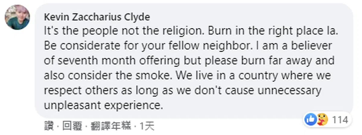 “这是人的问题,不是宗教的问题。在该烧的地方烧啦!体谅一下你的邻居。我本身也是相信农历七月要烧冥纸的信众,但你应该在远一点的地方烧,同时也要留意你所造成的烟霾。这是一个彼此尊重的国家,所以我们不该去制造那些没必要的不愉快。”
