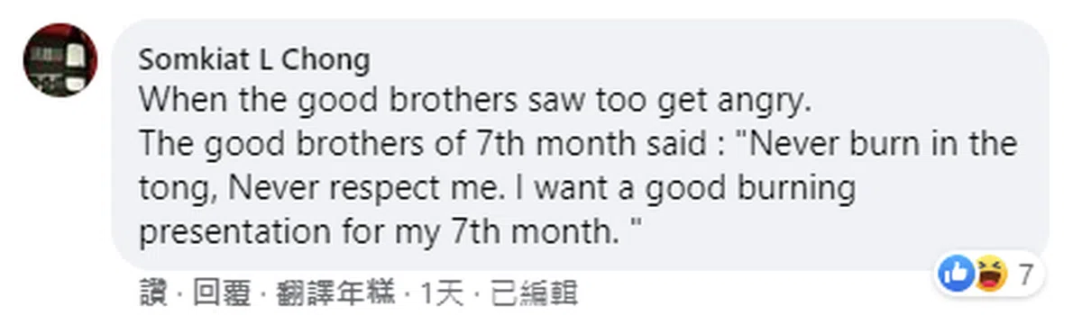 “‘好兄弟’看了都有火。农历七月的‘好兄弟’会说:‘没有在桶里烧,就是不尊重我。我只想要大家在农历七月好好祭拜我啊!’”