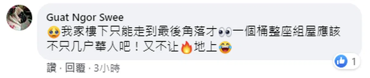 “我家楼下只能走到最后角落才看见一个桶,整座组屋应该不只几户华人吧!又不让在地上烧。”
