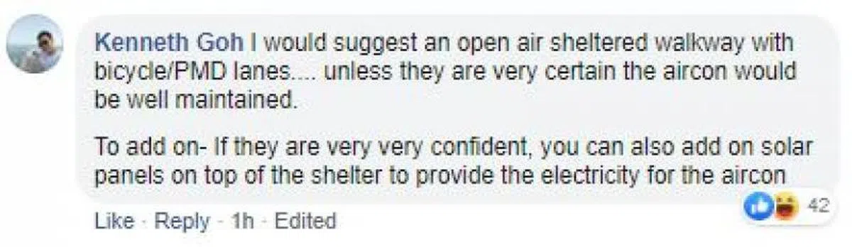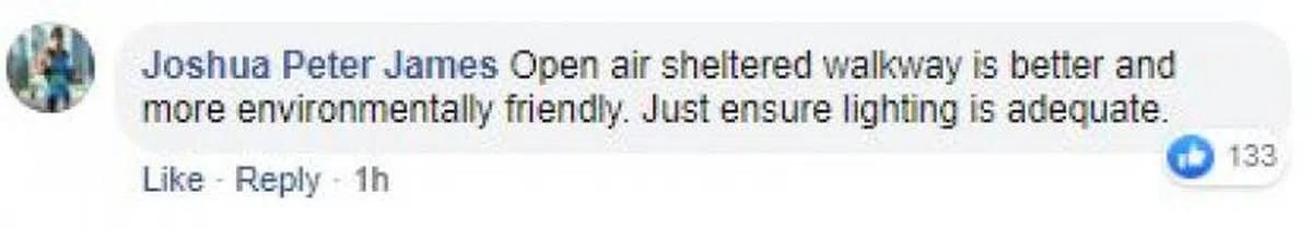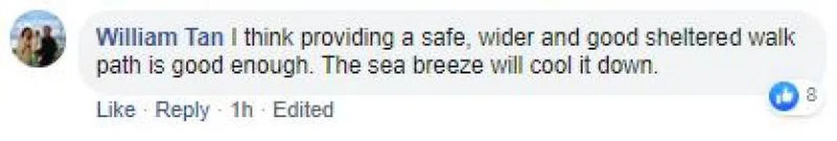 然而,大部分网民似乎对冷气人行道的构想并不感冒,认为没有冷气反而更为环保,也更能满足防疫要求。有网民建议,可以考虑在开放式走道旁,添加脚踏车或电动个人代步工具(PMD)的行驶通道。如果要设计冷气装置,则最好使用太阳能供电,并定期保养冷气系统。