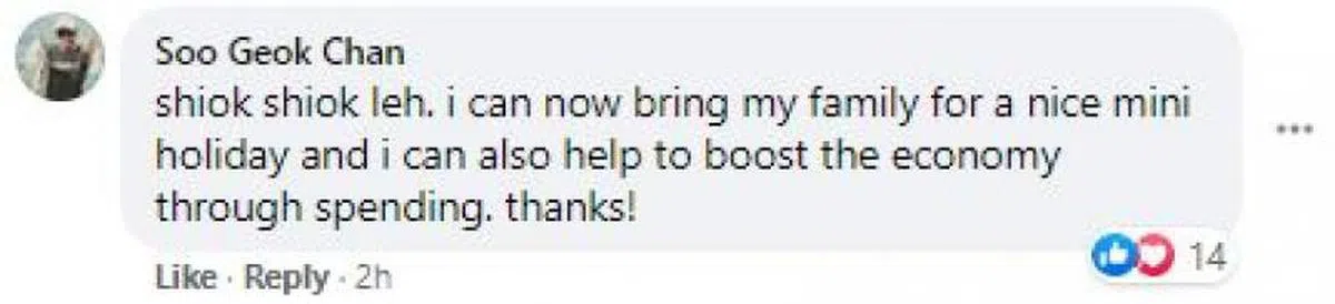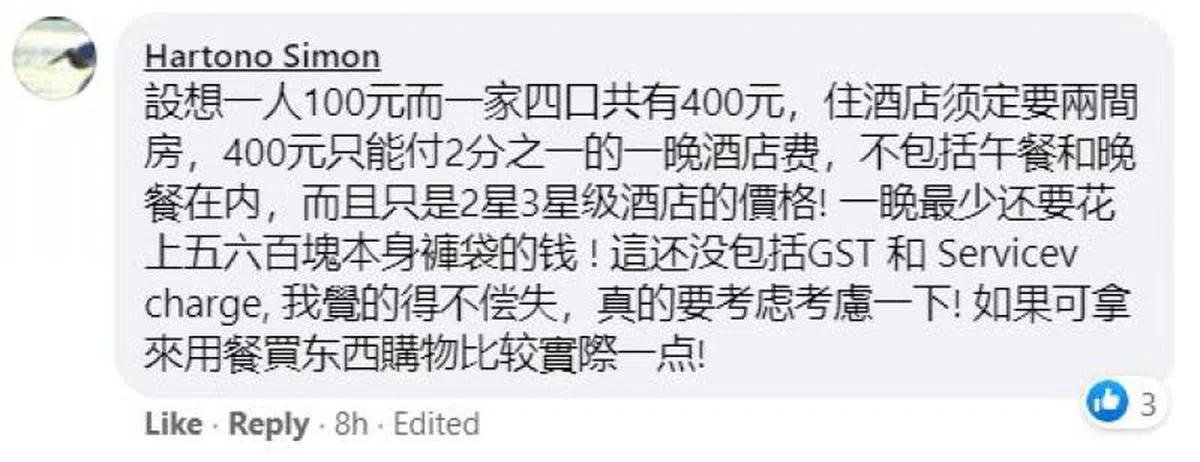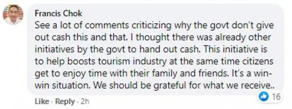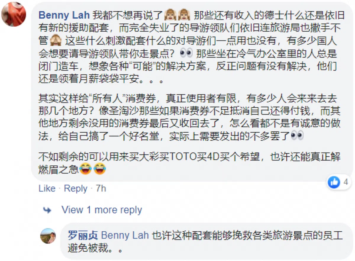 当然也有更多网民跳出来说:呃,搞错重点了吧?这是为了拯救本地旅游业而发放的消费券,不要与政府早前发放给国人的600元现金的疫情纾困补助金搞混。