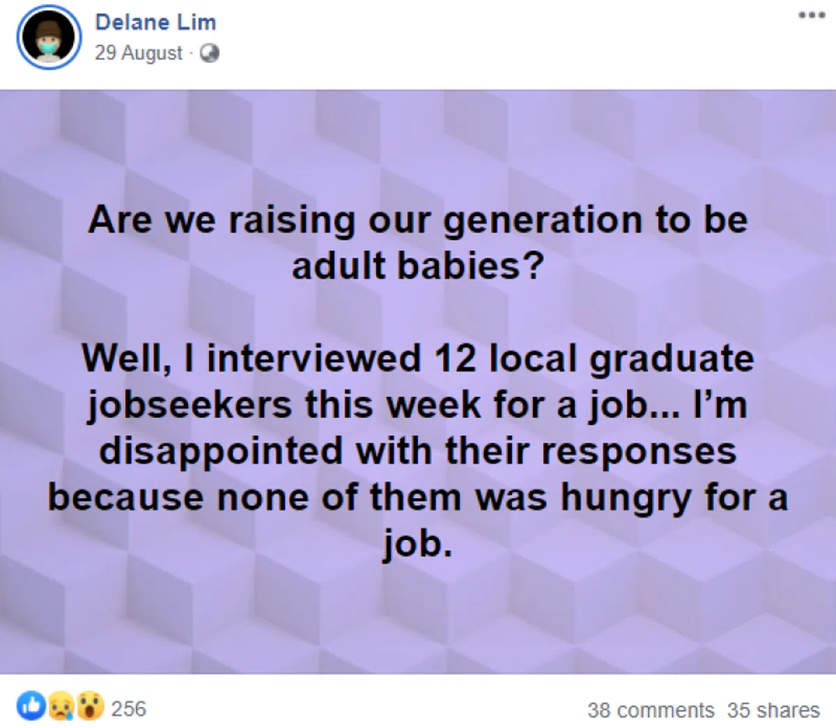“我们是不是正在将下一代培养成巨婴?我这周面试了12名正在找工作的本地大学毕业生……他们的回复让我感到极为失望,因为没有一个人对找工作这件事表现出足够‘饥渴’。”