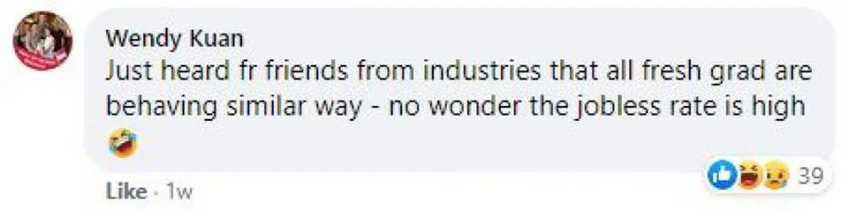 这位网民说,听业界朋友透露,刚毕业的学生似乎都是如此——难怪失业率那么高。也有网民指出,年轻人似乎一身“公主王子病”(Self-entitlement 也译为自我权利意识),这都还未踏入职场呢。