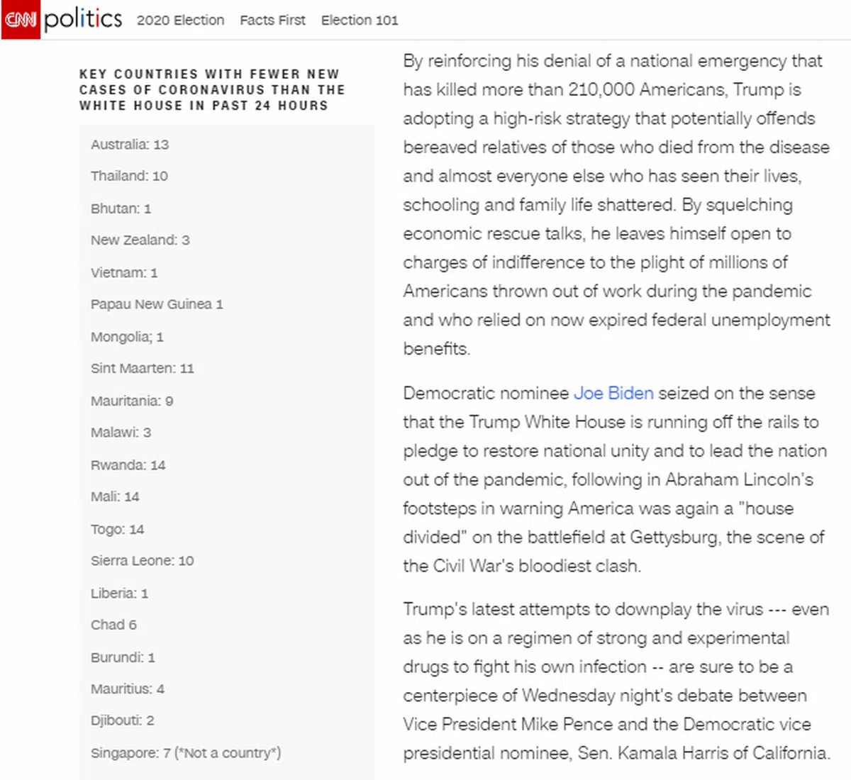文章概述了特朗普应对冠病疫情的“不负责任的态度”的方方面面,并在文中列出一个图表说明过去24小时,比白宫更少冠病个案的国家。