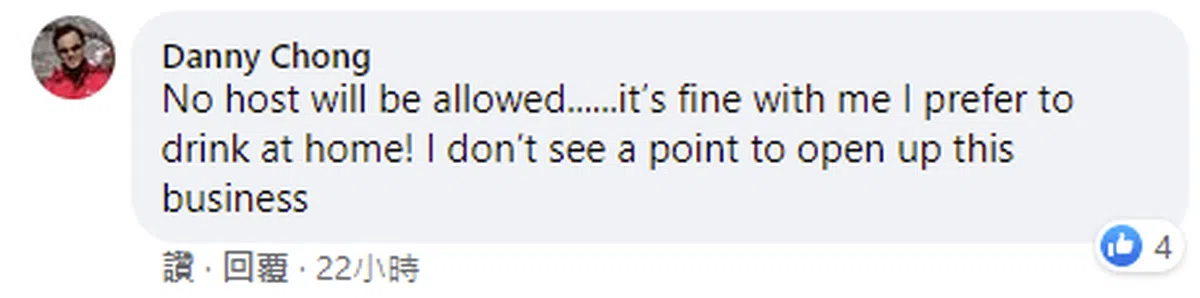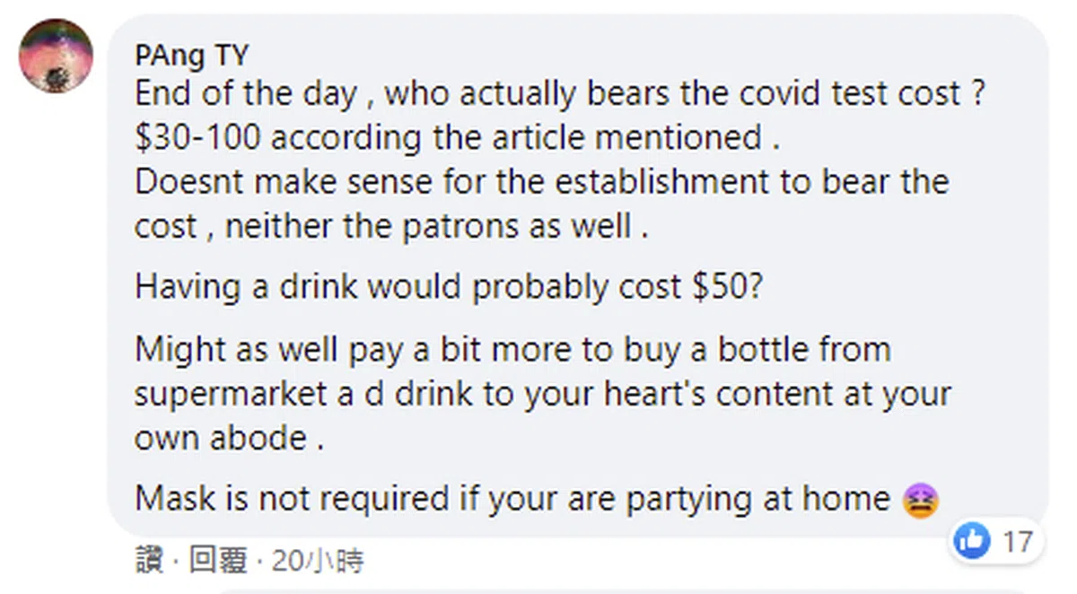 “……无论是由业者或消费者来承担检测费用都说不过去吧?喝一杯酒就要50元,那你还不如花一点钱在超市买一瓶酒回家随心所欲地喝,至少在家搞派对还不用戴口罩咧!”
