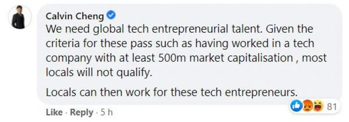 “我们需要全球科技创业人才。考虑到目前各种工作准证的标准,如曾在市值至少5亿美元的科技公司工作过,多数本地人都不具备资格(红蚂蚁在此澄清一下,准证是针对外来科技人才,本地人无需申请)。本地人只能为这些科技企业家工作。”