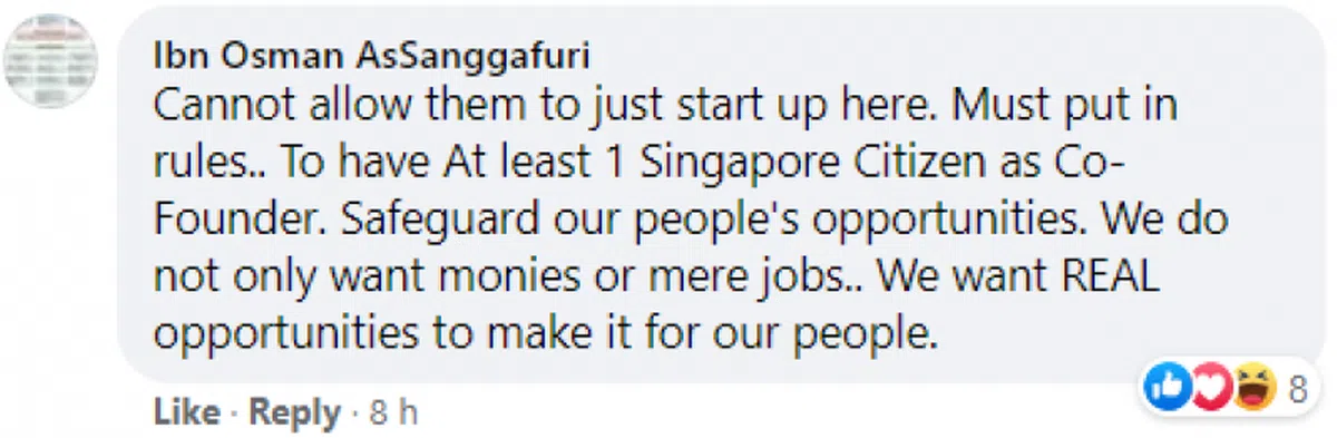 也有网民建议,应该要求这些科技人才在新加坡设立公司时,必须找一名新加坡人与他合伙,这样才能为新加坡人创建真正有意义的机会。