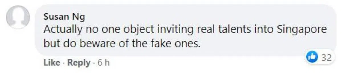 “实际上,没有人会反对邀请‘真人才’到新加坡发展,但请小心那些‘假人才’。”