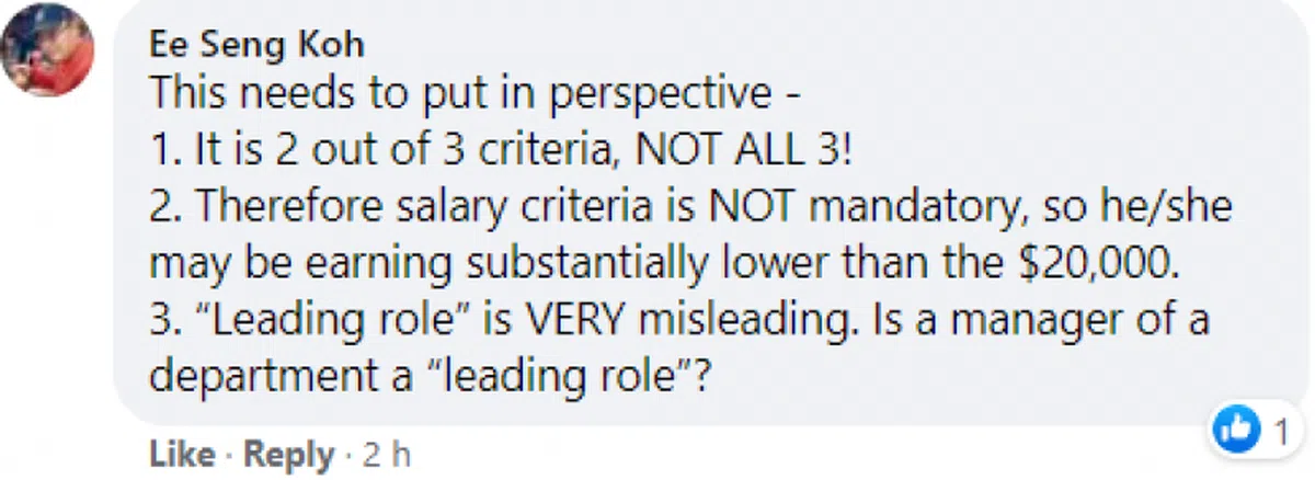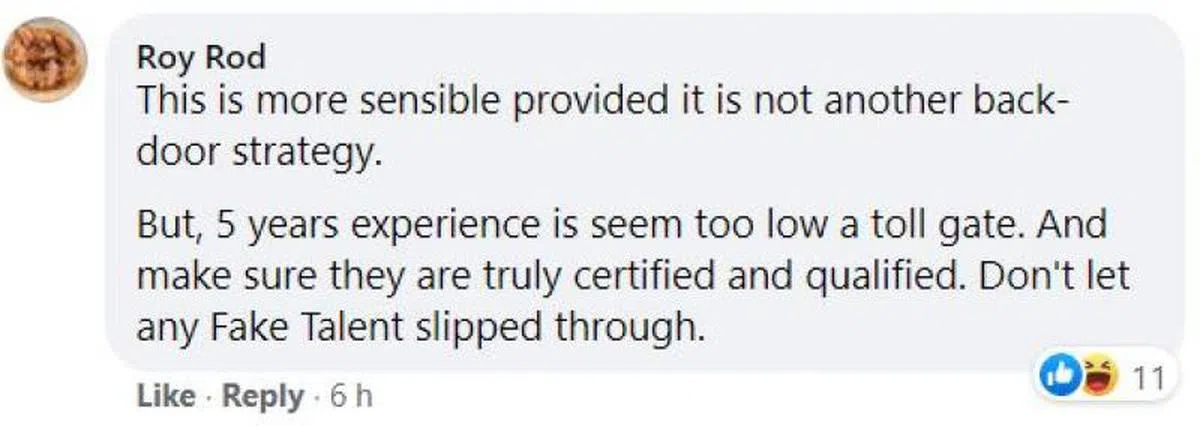 针对申请准证只须满足三项条件的其中两项,网民认为这样做可能存有漏洞。为何不是满足全部三项条件才能申请呢?这么一来,很多固定月薪达不到两万新元的人,很可能也能申请成功,这不就无形中为“假人才”开了一扇方便之门?