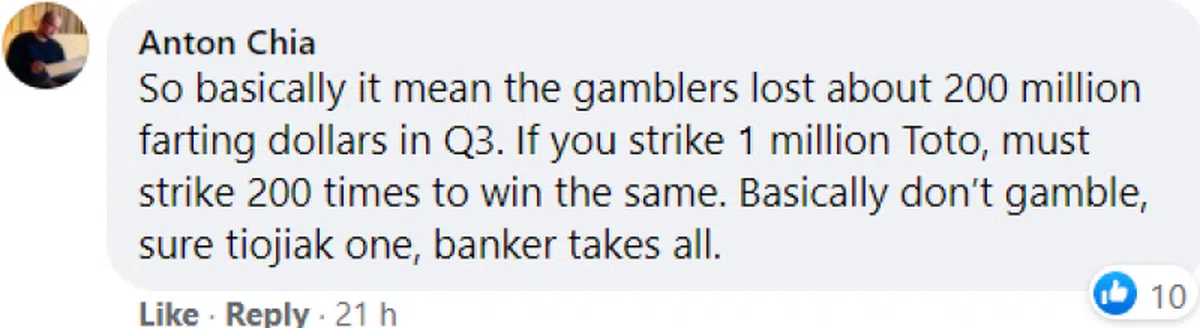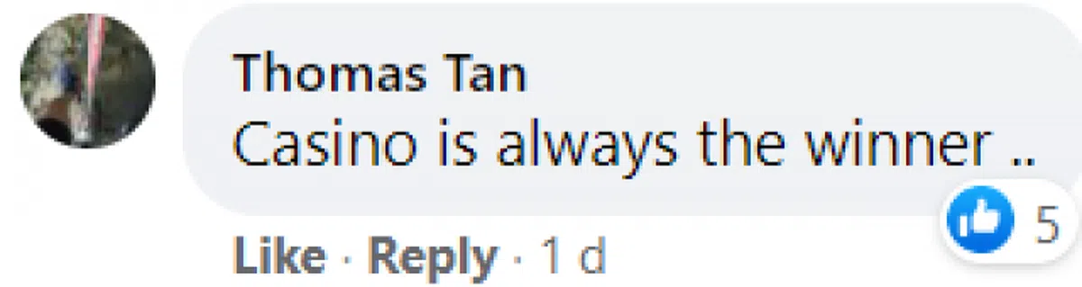 以下这名网友指出,当赌场的账簿由红(亏损)转黑,即意味着许多新加坡人的账簿由黑转红。