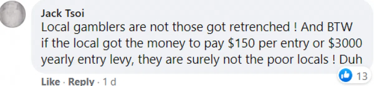 有钱有闲进入本地两大赌场的国人,肯定不会是那群被裁退后兜里没钱的。因为本地人要进赌场,每次都得掏出150新元入场费,或者每年3000新元的年费,肯定不会是穷人。