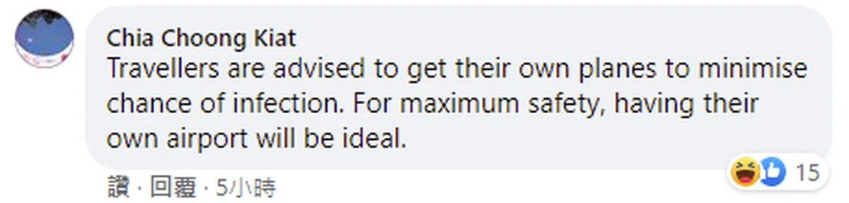 “干脆建议旅客自己搭自己的飞机,这样就能减少感染的机会了。最安全的做法是,每个人都有自己的机场那就完美了”