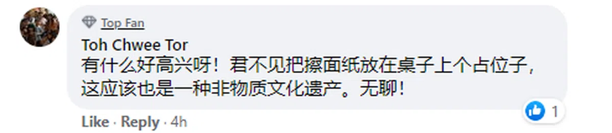 也有网民调侃说,小贩中心的纸巾霸位文化是否也属于非物质文化遗产的一部分?