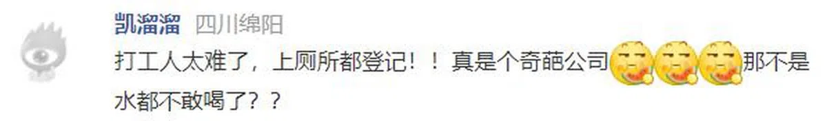 也有网民猜测那些员工应该都不敢喝水。毕竟上个厕所都要登记,否则会被罚款,真是太难为打工仔们。