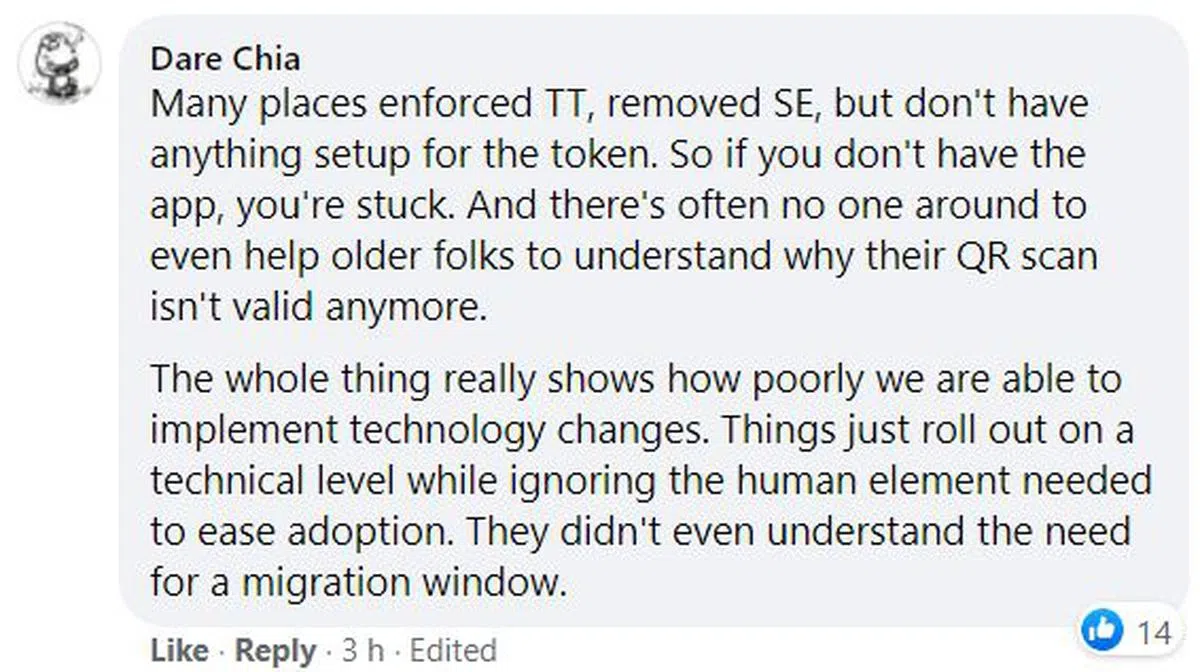 “许多地方强制推行‘合力追踪’登记,撤除现有登记方式,但没有设置扫描携手防疫器的设备。如果没有‘合力追踪’应用程式,你根本无从进入。另外,这些地方也时常无人协助年长者,告知他们为何不能使用QR码登记。”