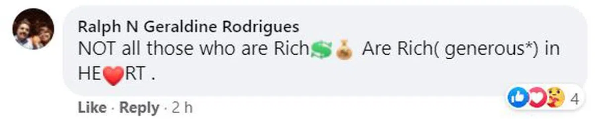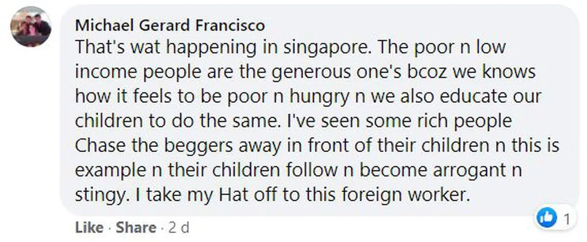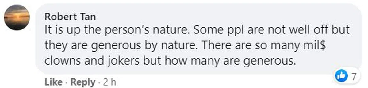 “这就是新加坡正在发生的事情。贫困与低收入群体的人一般慷慨,因为我们(网民将自己归纳为贫困与低收入群体)知道贫穷和饥饿的感觉。同时,我们也教育孩子做同样的事情。举个例子,我看过一些富人在孩子面前赶走乞丐,他们的孩子也变得傲慢和吝啬。”