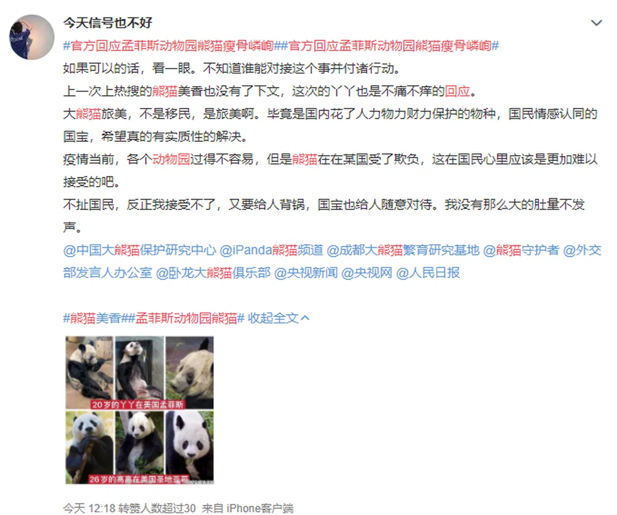 也有网友提及去年10月,华盛顿的史密森尼国家动物园也传出疑似对另一头大熊猫美香照顾不周,认为两起事件都应该有一个“实质性的解决”。