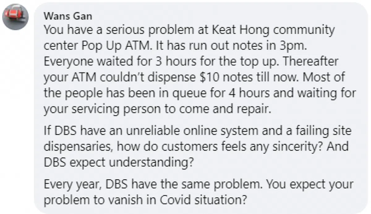 “如果星展银行的网上预约系统不可靠,提款机也状况连连,顾客又怎能感受到诚意?星展银行还想得到我们的体谅?年复一年,星展银行都有同样的问题。你以为问题会随着疫情而消失吗?”