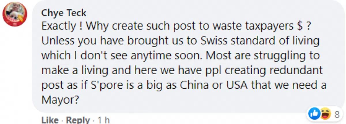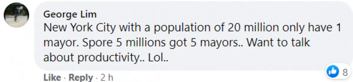 也有网友对新加坡“市长”的概念深感不解。毕竟新加坡并没有中国或美国那么幅员广阔,市长一职给人的感觉确实有点多余。另一名网友也指出,纽约市2000万人口,只有1名市长,新加坡500多万人口却有五名市长,很是费解。