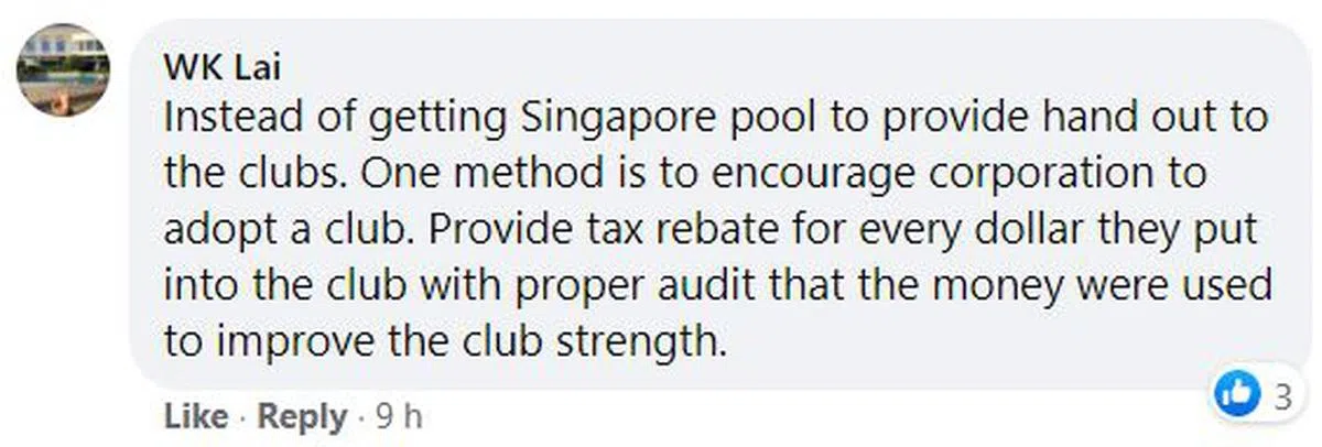 不过,也有网民建议从民间着手解决问题,让当局鼓励企业注资足球俱乐部。作为回报,政府或许可考虑回扣资助企业方的税务。