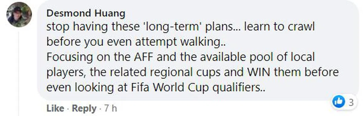 “请停止这些‘长期’计划。先学会爬行,才来尝试如何行走。先专注于东南亚足球协会(AFF)与现有本地球员的发展,以及赢得相关的区域竞赛杯,再来看世界杯预选赛。”