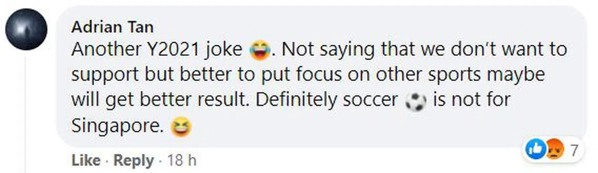 “这是2021年的另一个笑话。不是说我们不要支持(足球),而是应该将专注力放在其它运动项目上,或许还能得到更好的成绩。足球,绝对不是新加坡可行的。”