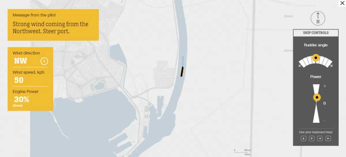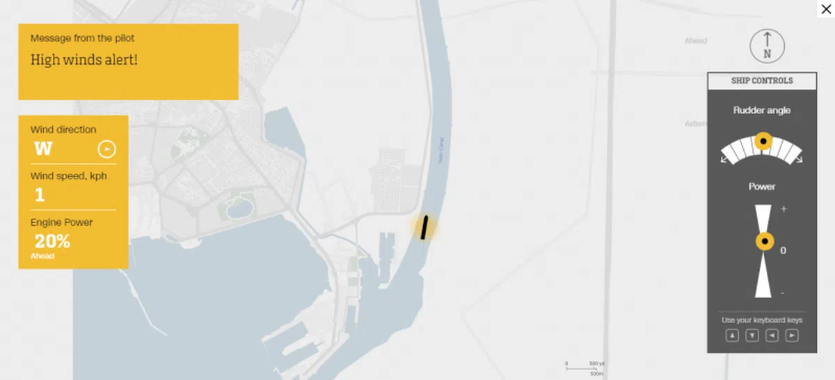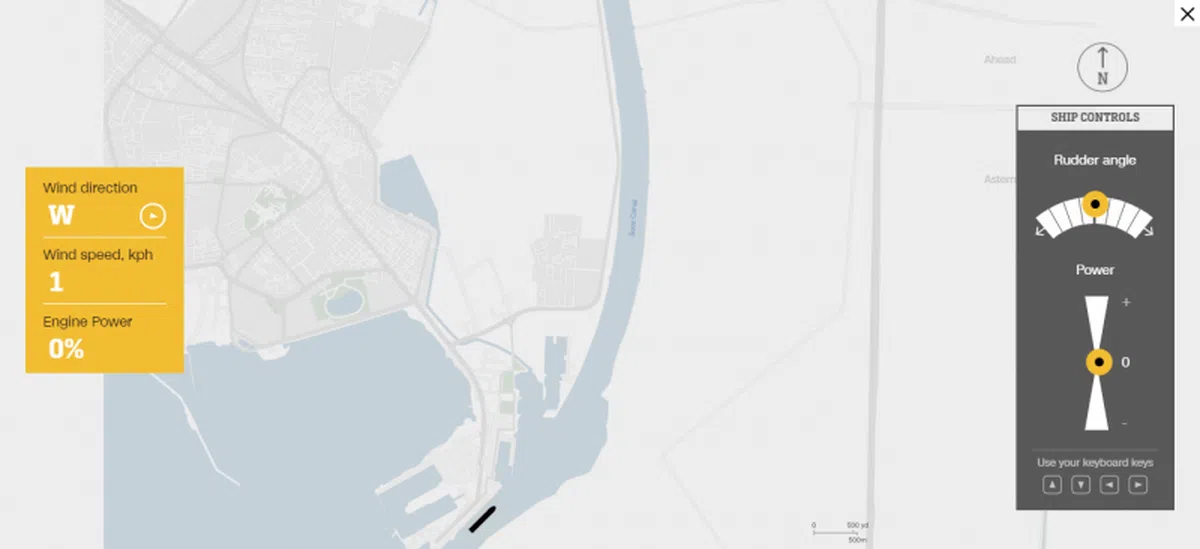 游戏里的船只从苏伊士运河南端入口进入,你只须要掌控两样东西——船舵和引擎动力,左侧会显示风速和风向,后两者也是避免撞到岸边的最大挑战。