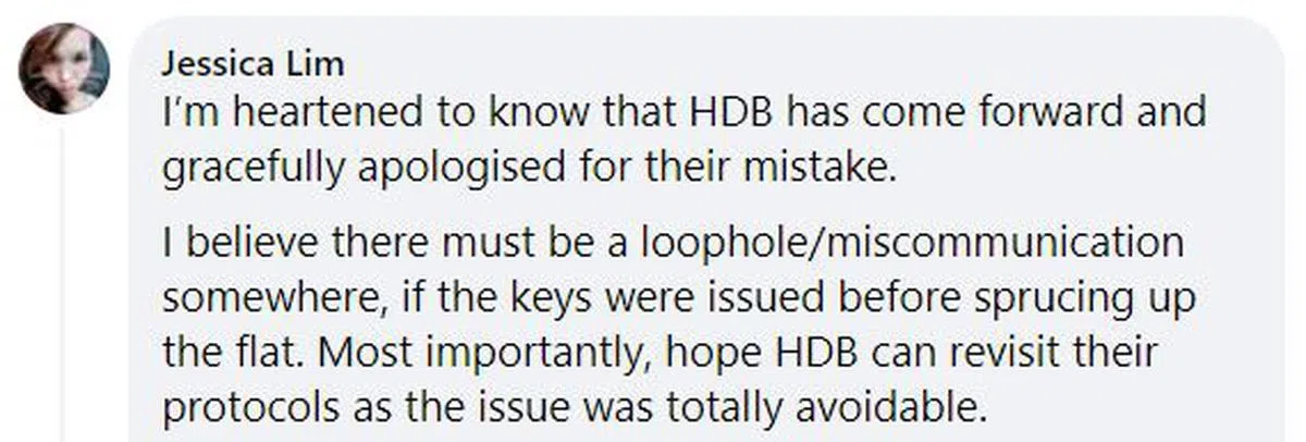 这位网民表示,她很高兴建屋局挺身而出,为他们的失误道歉。她相信其中一定有误会或漏洞,才发生了这起不愉快的事件,并希望当局能重新审视现有流程,避免发生类似意外。