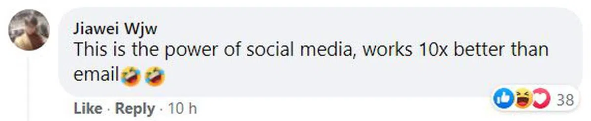 也有网民笑称,果然社交媒体的传播速度,比发电邮给当局还快上十倍,问题可以立即得到解决。