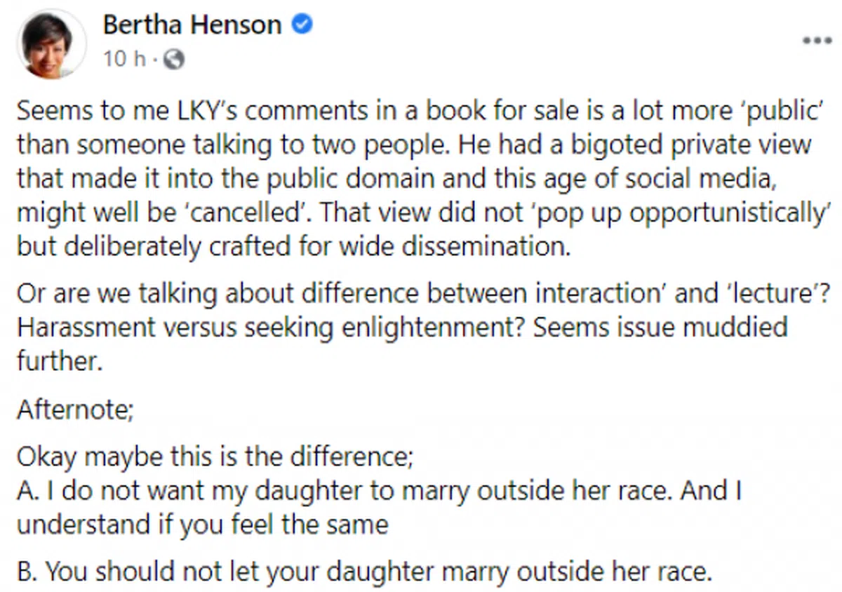 资深媒体人默乐(Bertha Henson)看到毕丹星的贴文后,也来掺和一脚说,毕丹星将“李光耀”搬出来,反而让整个事件更混乱了。她认为那根本不是建国总理私下的谈话,更不是在写书过程中与两人聊天时随意说出来的私人意见,而是刻意写出来让公众阅读的“公开看法”。
