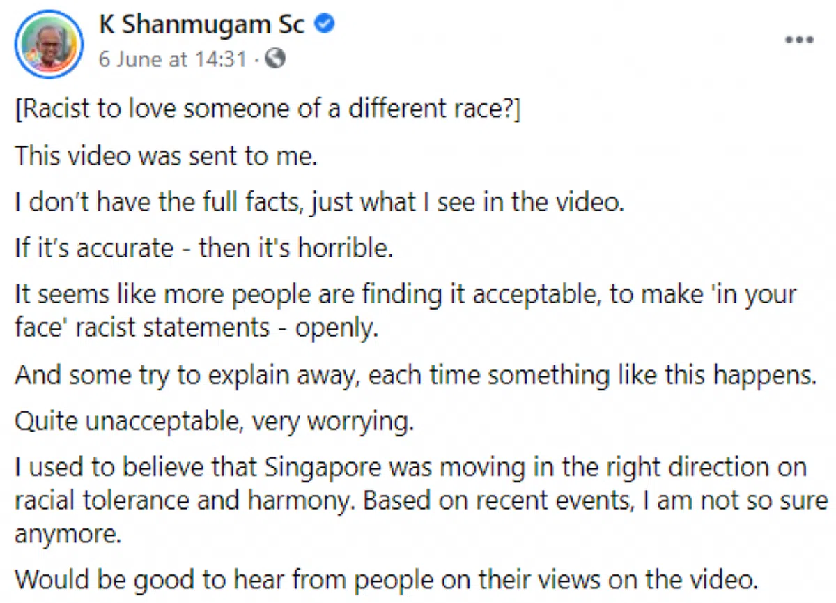 “似乎有越来越多人认为,公开发表咄咄逼人的种族主义言论,是可以被接受的行为。每次发生这种事情,也总有人会尝试辩解开脱。这是不能被接受的行为,也很令人担忧。我过去一直相信,在种族包容与和谐方面,新加坡一直朝着正确的方向前进,但看到最近的一些事件,我已不再这么确信。想听听大家对上述视频的看法。”