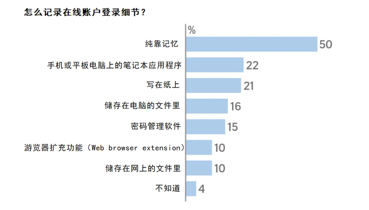 许多新加坡消费者也依赖记忆力来记住他们的登录细节。调查显示,本地有50%的人这么做。