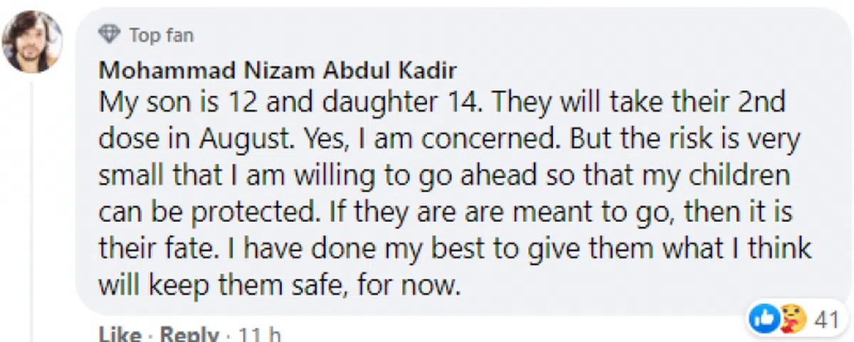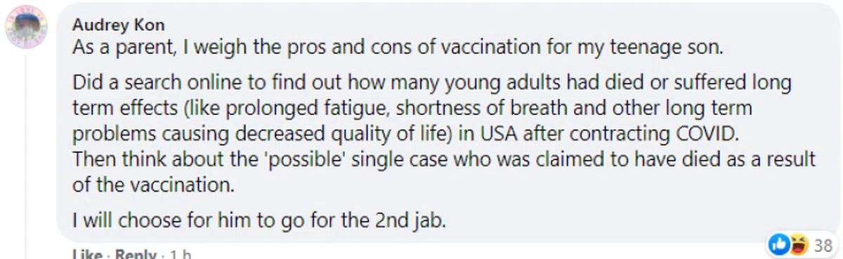 “在衡量了利弊,收集了孩子感染冠病后可能出现的各种后遗症,然后想想那一名在接种疫苗后死亡的男生,我决定让儿子继续接种第二剂疫苗。”