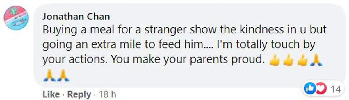 这名网民则说,请一名陌生人吃饭已经难能可贵,而愿意再付出心力喂陌生人吃东西更是让他感动,此举肯定让凯鲁的父母感到十分自豪。