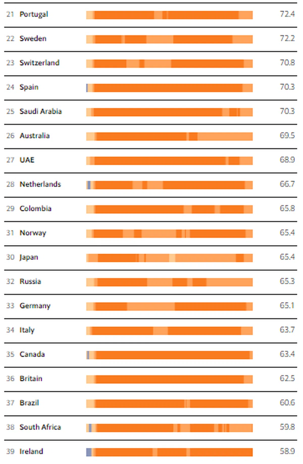 印度、台湾和马来西亚的排名则是倒数最后三名,垫底的马来西亚指数是27.3。