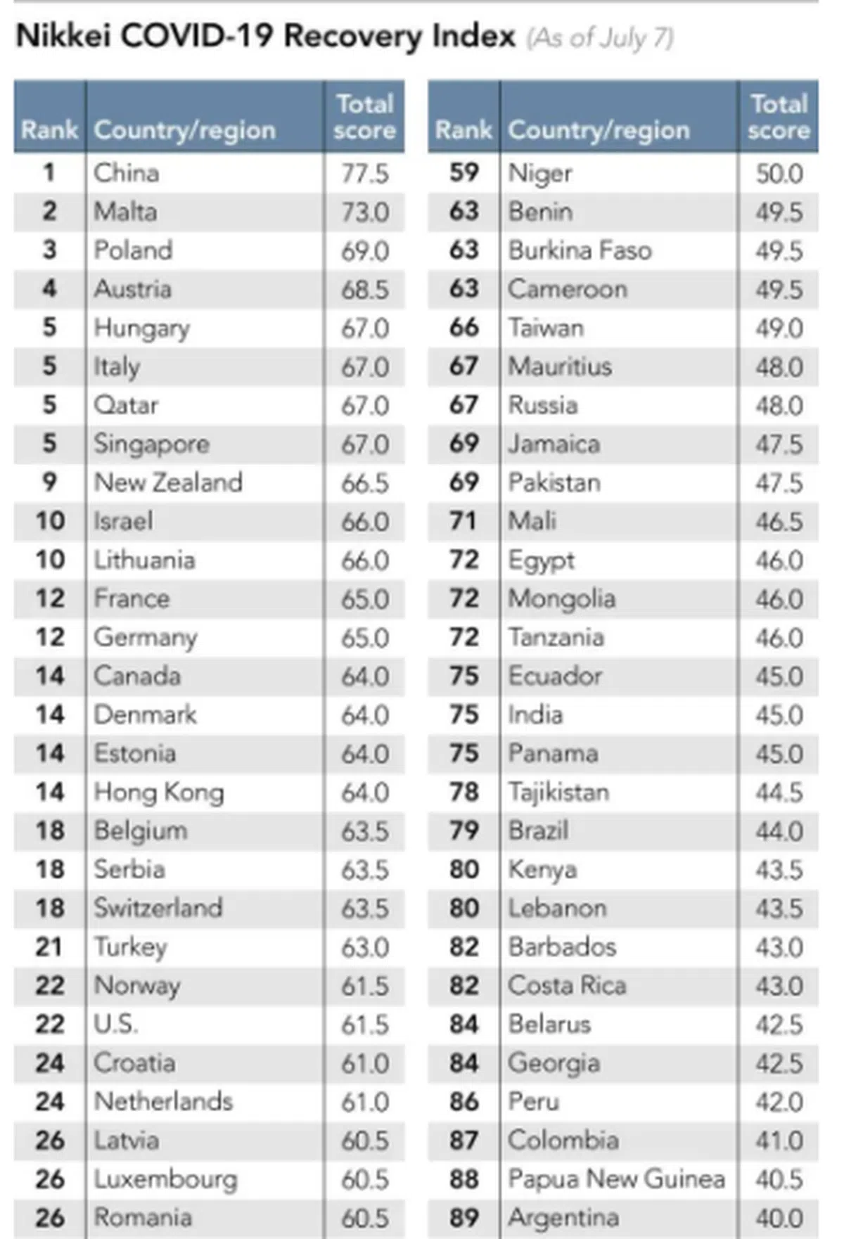 《日经亚洲》上周三(7月7日)发布的冠病疫情复苏指数(Recovery Index),新加坡在120多个国家与地区中名列第五名,是个相当不错的成绩。https://asia.nikkei.com/Spotlight/The-Big-Story/Nikkei-COVID-19-Recovery-Index