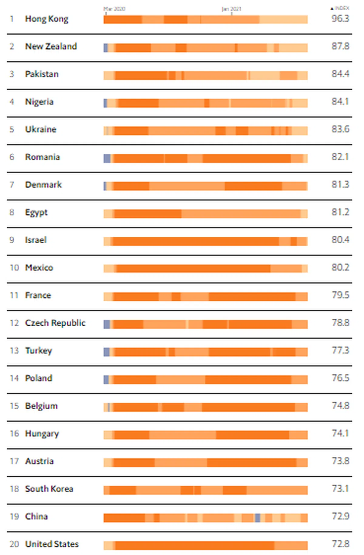 香港的名次是14名,指数为64。台湾排名第66,指数为49。然而抗疫至今最成功的澳门则不在此排名中。