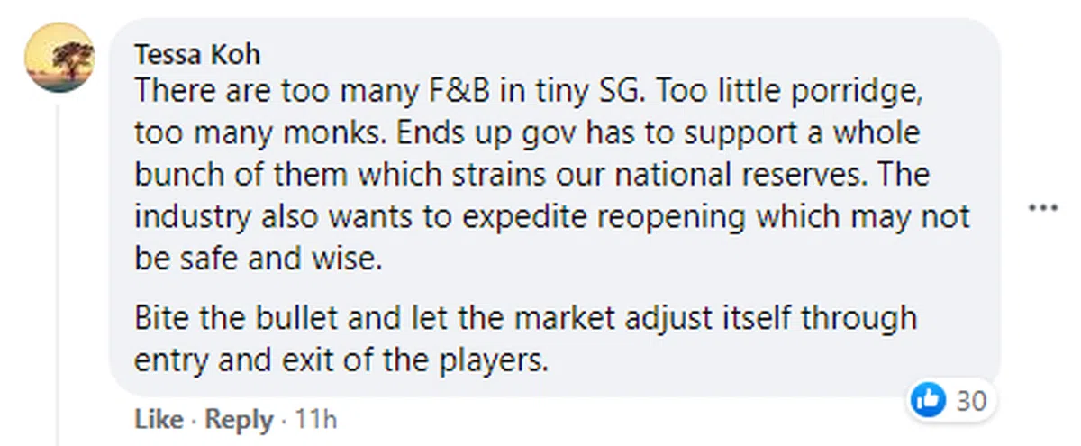 有网民认为,在新加坡这片小小的土地上已经有太多的餐饮企业,僧多粥少,以致于政府不得不从国家储备拨款支持他们。