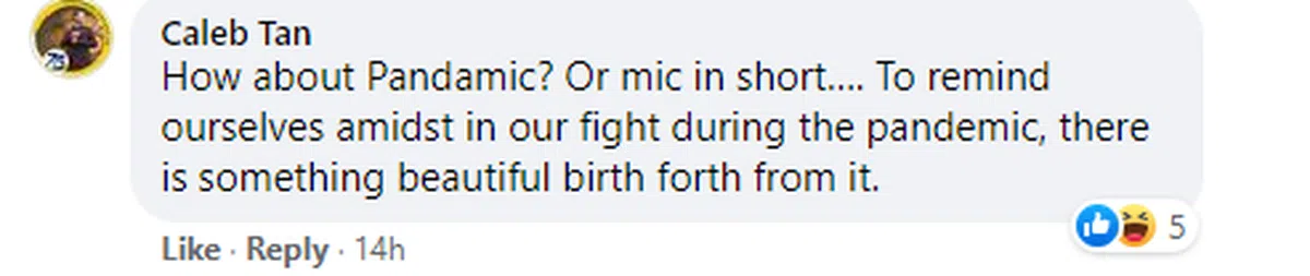 有网民提出,大熊猫宝宝出生于冠病疫情期间,英文名可以叫做“PANDAmic”,即把熊猫(panda)和大流行(pandemic)合成一词,来纪念国人抗疫期间也迎来了美好的事情。华文名可取为“盼盼”,寓意为盼望已久。