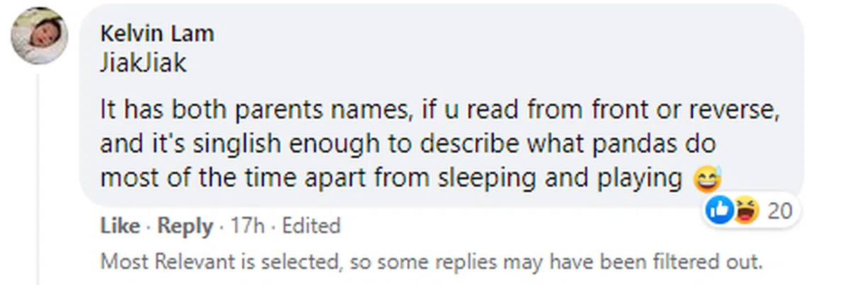 又或者可以取“JiakJiak”(福建话吃的意思,也可说是新加坡英语),完全描绘了熊猫的日常生活,除了睡觉和玩耍,大部分时间都花在吃上。此外,这个名字也是“JiaJia”和“KaiKai”名字的结合体。