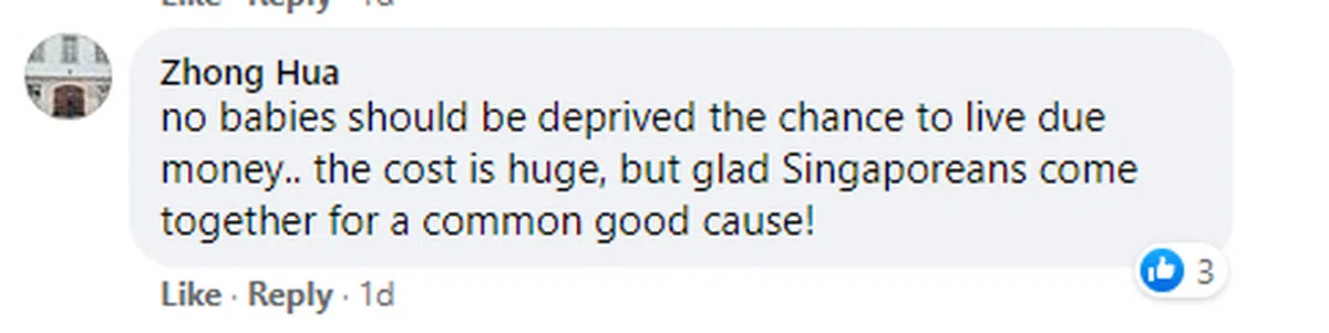 另一人说,任何人都不应该被剥夺应有的生存机会,医药费是庞大的,但很高兴新加坡人为了公益团结一起。
