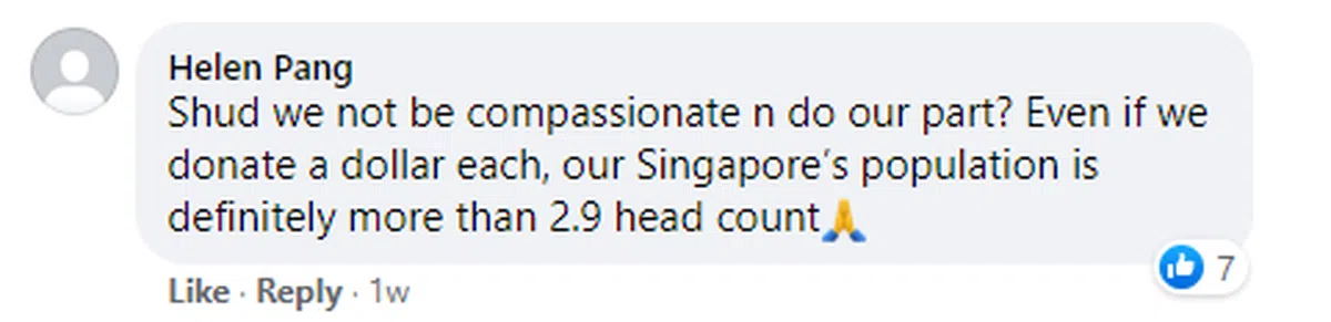 有捐款者就呼吁其他国人也出一份力说,我们难道不该心怀同情,尽我们的一份力量?即使每人捐1元,我们新加坡的人口也超过290万。