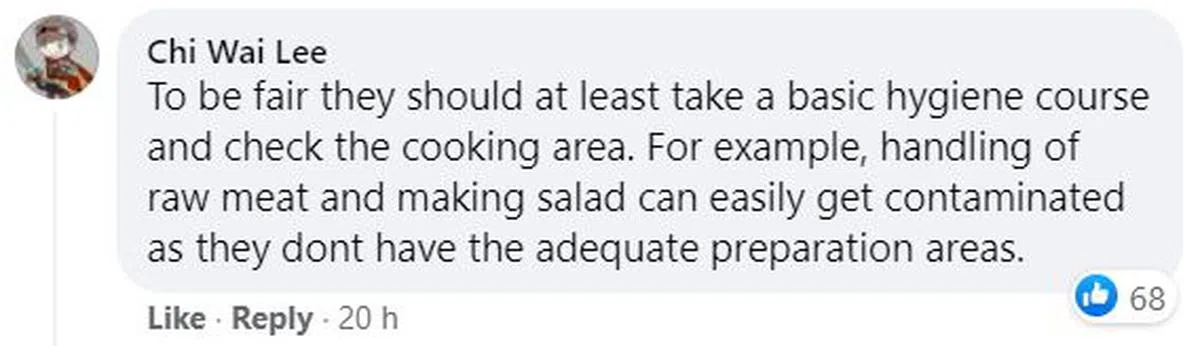 另一些网民说,当局至少得要求业者上基本的食物安全课程,同时派人上门查看烹调环境。